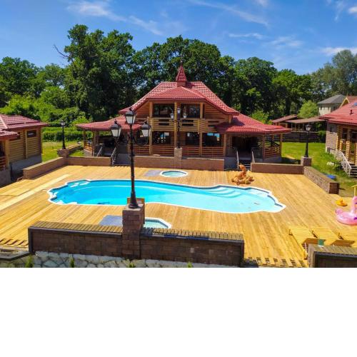 Ubytovanie Pastoral Resort. A hot tub and a fireplace are featured in these traditional log cabins. Ubytovanie Pastoral Resort sa nachádza v meste Velikiy Les (Ukrajina - Kyiv Region).
